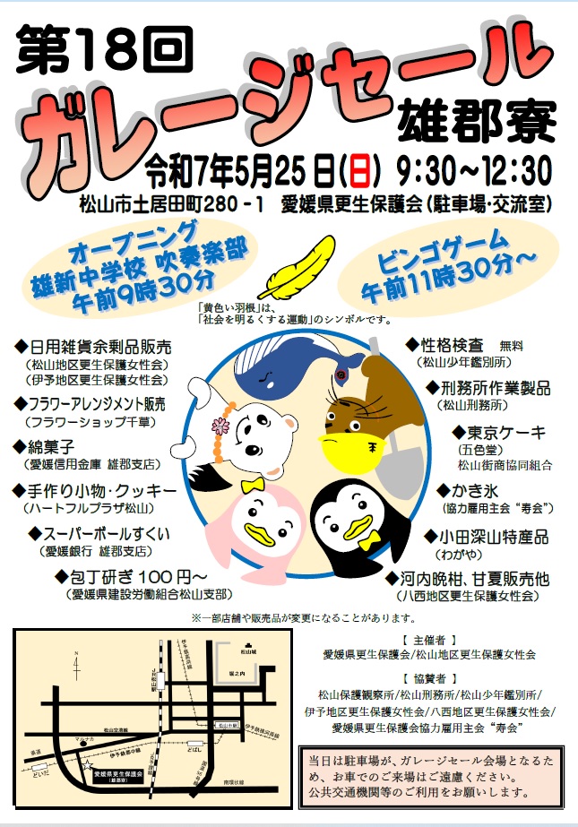 松山市土居田町における初夏の恒例行事である「第15回雄郡寮ガレージセール」が,去る5月26日(日),愛媛県更生保護会(通称「雄郡寮」)の駐車場,地域交流室及び会議室を会場に,盛大に開催されました。